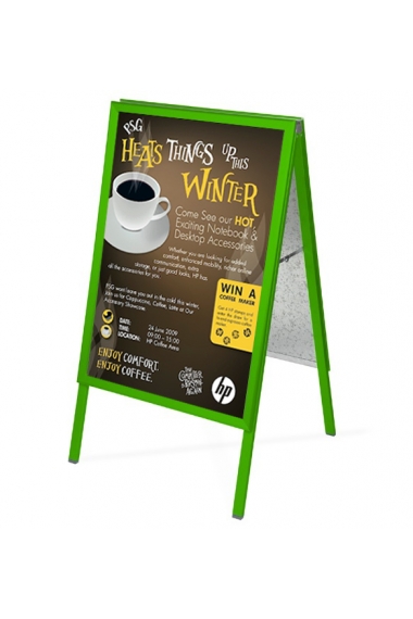 These A Boards are available in 17 colours including 3 anodised, 12 powder coated and 2 wood grain finishes. Strong aluminium and steel construction provide great stability and they fold away easily for night time storage. The frame incorporates our snap open and close system for fast poster change. Supplied with 2 full colour, high quality encapsulated posters.